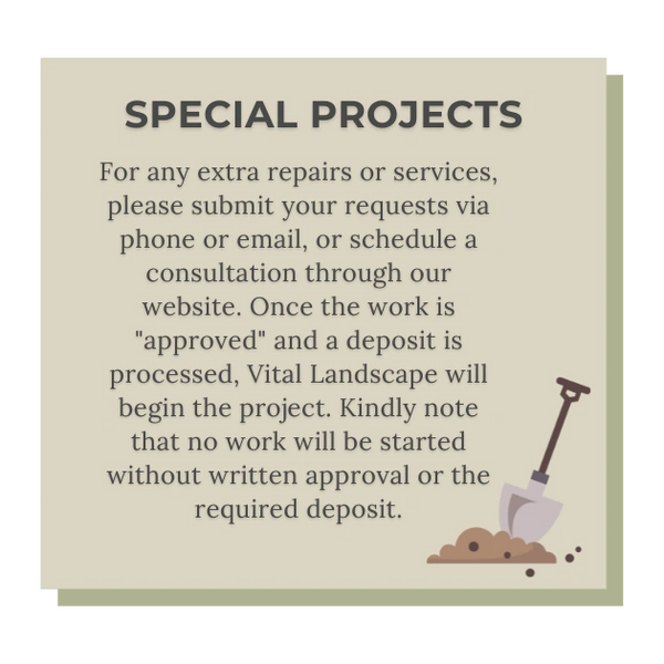 Please note that special projects and additional/emergency services or repairs requested by property owners or agents, which require additional labor or are not included in the contract, are not covered by these monthly maintenance packages.